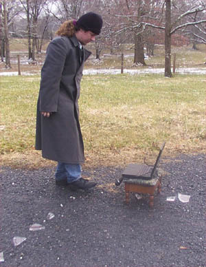 This is what I see, sitting in the driveway, under a cloudy sky with a sun playing hide and seek. As soon as he arranges his octave, boy returns to adjust his recording software. And then he stands up and kicks the first chunk of ice. It skids under the microphone and shoots under the stool. He deftly kicks a few more times. Then he shuffles them a bit, scattering them, ricocheting one of another, etc.