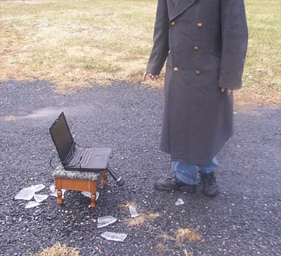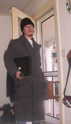 Well, before I know it, he comes inside. He leaves with the computer, a microphone, and a small footstool. Intent upon recording this madness, I stepped into my clogs and followed him.