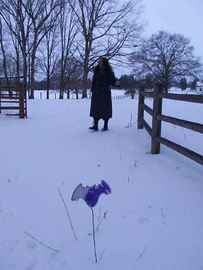 I really like the blue light outside. All the reflected snow and oblique sunlight filtered through heavy clouds. Water makes pretty pictures. I'm going to miss this willow oak when we move. It drops such nice sticks. Tom seems to want to pee on the minidish. I better hide his boots. And, finally, our happy little bat still guards our front steps.