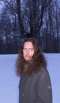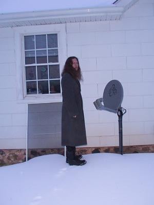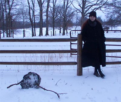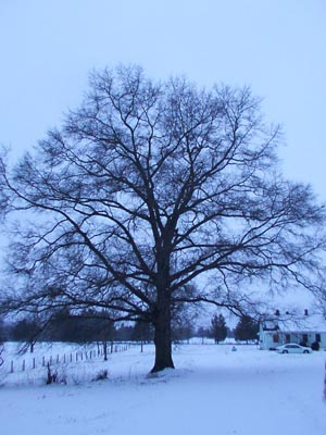 The driveway did show our path, but our footprints were no more than half a centimeter deep. I've been claming the locals are pussies for cancelling school tomorrow, since we've had no snow today, there are not ice-laden wires/branches, and the wind isn't blowing. But I guess that stuff doesn't come up off the road too easily. And with neighbors like ours, who try to drive a hundred yards WITHOUT CLEARING OFF THEIR WINDSHIELD, well, the death count may be kept down by keeping people home, though I'm not sure it's so good for the local gene pool. Tom and I stood and laughed warily for a few minutes. Tom apparently grew a tree out of his head.